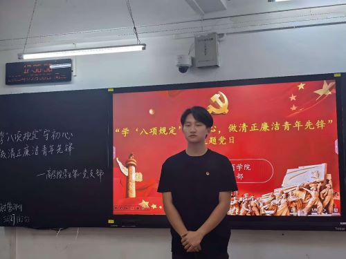 为增强青年学生的政治意识和纪律观念,深入贯彻中央八项规定精神学习教育,OK138太阳集团学生第一党支部于2025年5月28日17时30分在OK138太阳集团303教室举行了一场主题党日活动。本次活动由OK138太阳集团学生第一党支部副书记韩敏炜同志主讲,旨在引导支部同志深入学习党规党纪,强化廉洁自律。