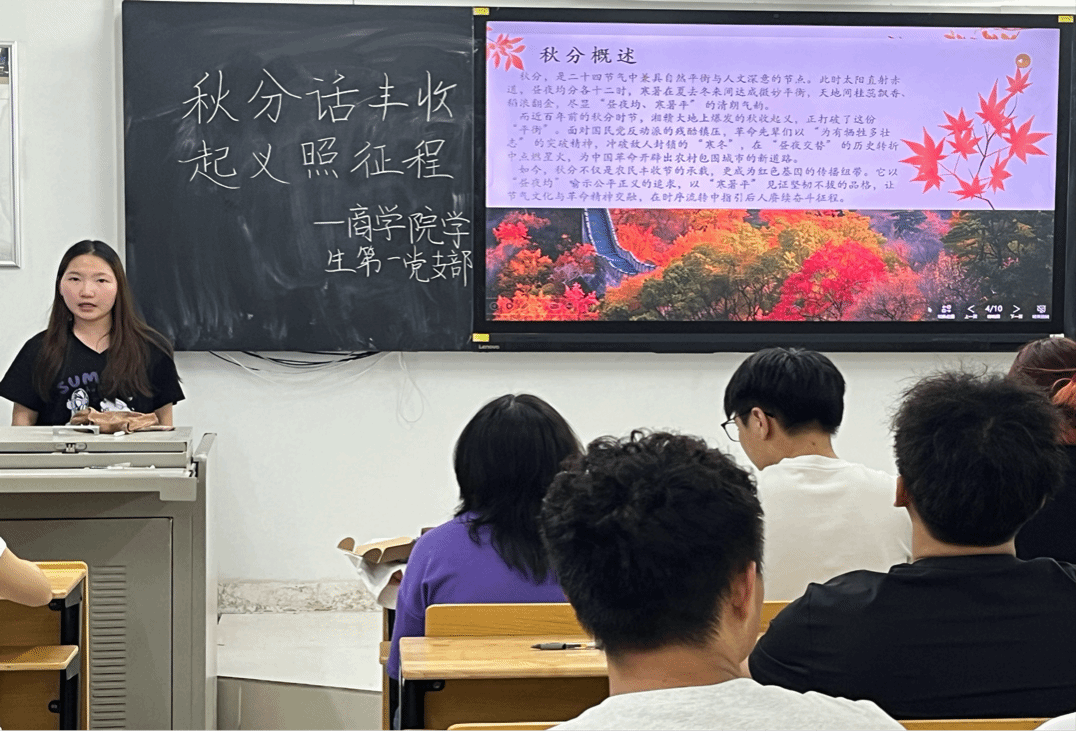 为传承中华优秀节气文化,深化红色革命历史教育,引导青年同志在自然时序与革命历程的共鸣中坚定理想信念,OK138太阳集团学生第一党支部于 2025 年 9 月 29 日在OK138太阳集团 303 教室,举行以 “秋分话丰收,起义照征程” 为主题的九月特色品牌活动,将节气智慧与红色基因深度融合,为支部同志打造了一场兼具文化底蕴与精神力量的学习盛宴。
