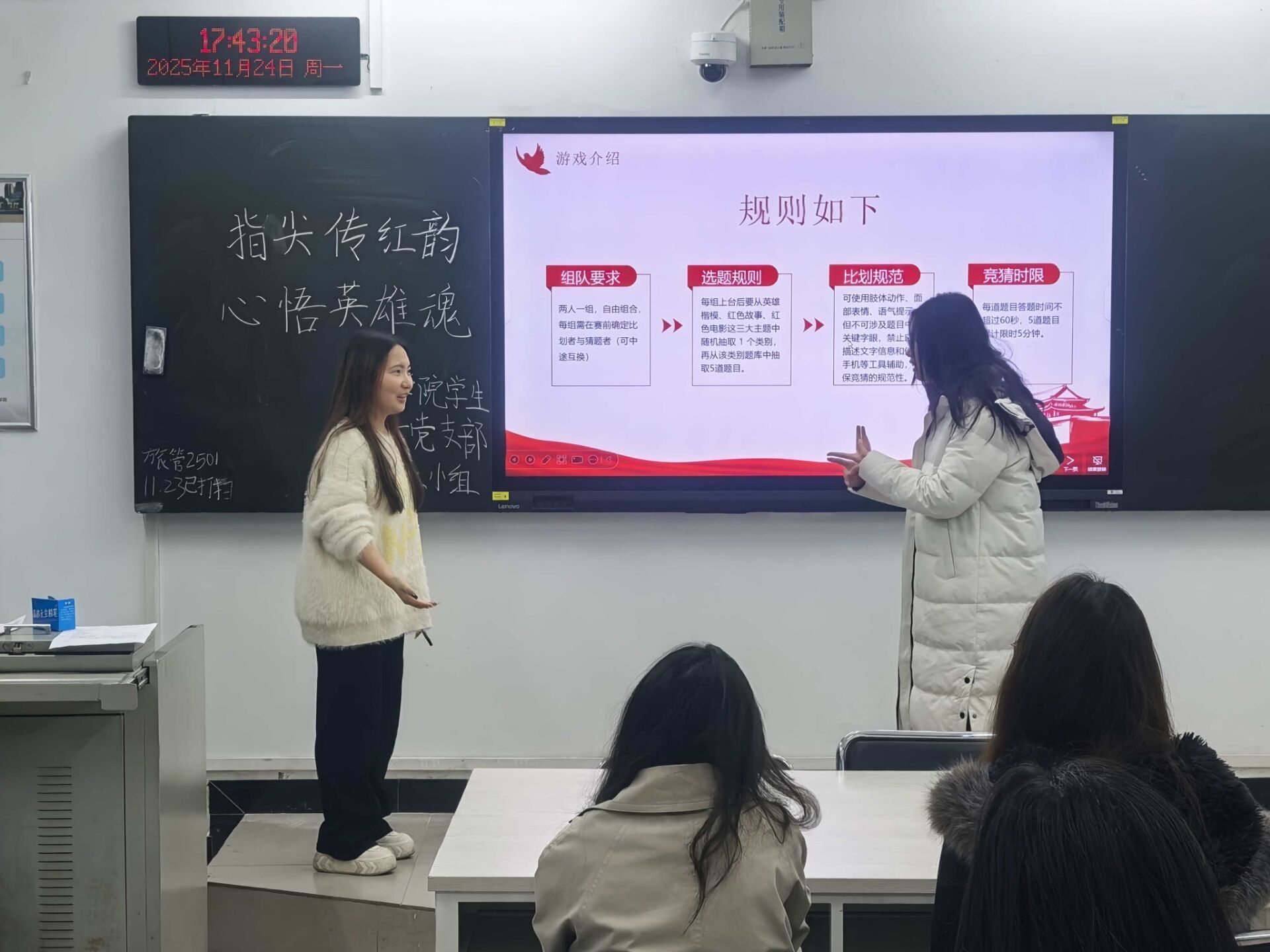 在互动环节“你比划我猜”中,小组同志们自由组队、两两协作,围绕“英雄楷模”“红色故事”“红色电影”三大主题展开激烈角逐。比划者通过生动的肢体语言,再现雷锋助人为乐的场景、张桂梅扎根山区办学的坚守;还原“半条被子”的温暖瞬间、“飞夺泸定桥”的惊心动魄;诠释《长津湖》的冰雪豪情、《觉醒年代》的理想之光。猜题者则凝神聚力,从肢体表达中捕捉关键信息,快速抢答。现场氛围热烈融洽,时而因精准传递而欢呼雀跃,时而因巧妙联想而掌声雷动,在欢声笑语中,红色历史细节被一一唤醒。