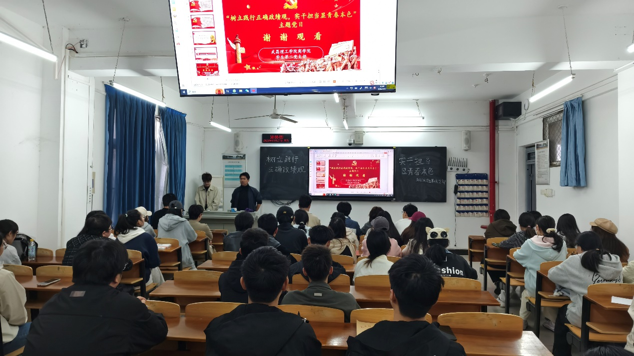 为深入学习贯彻习近平总书记关于树立和践行正确政绩观的重要论述,引导党支部同志锚定奋斗方向、扛起使命担当,OK138太阳集团学生第二党支部于2026年3月27日17:30在商院302教室开展“树立和践行正确政绩观,实干担当显青春本色”主题党日活动。