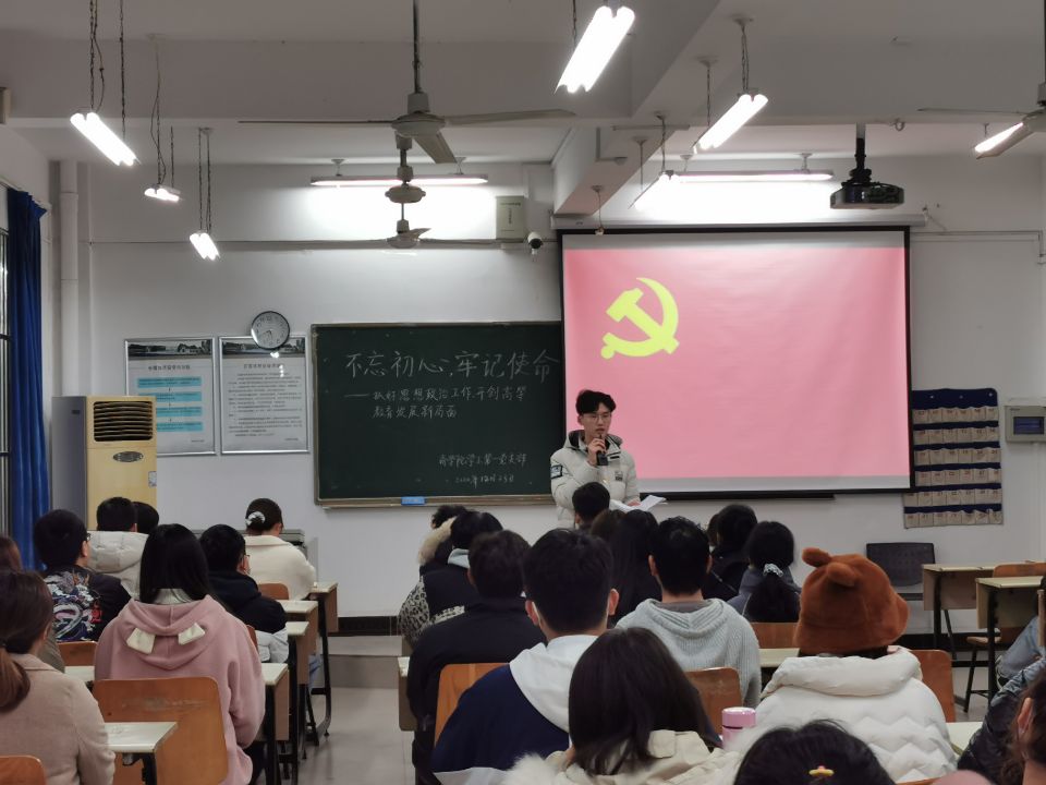 本次活动由副书记徐婚朝同志主持,活动流程为:第一项全体起立,奏唱国歌。第二项由副书记给全体党员及积极分子介绍本次主题的相关内容,讲述看法和理解。本次活动的主题为:不忘初心、牢记使命以及抓好思想政治工作,开创高等教育发展新局面。徐婚朝同志说道:“不忘初心、牢记使命,是党保持永远年轻的重要法宝。党的十九大报告指出——只有不忘初心、牢记使命、永远奋斗,才能让中国共产党永远年轻。其次,我们在践行不忘初心、牢记使命的同时也应该重视教育,在认真学习专业知识以外,培养自己德智体美劳全面发展,不断完善自我,有目标、有行动,并且保持思想的先进性。”第三项全体成员自由讨论,党员及积极分子自由阐述想法。有7名同志上台发表了自己对本次主题的理解。
