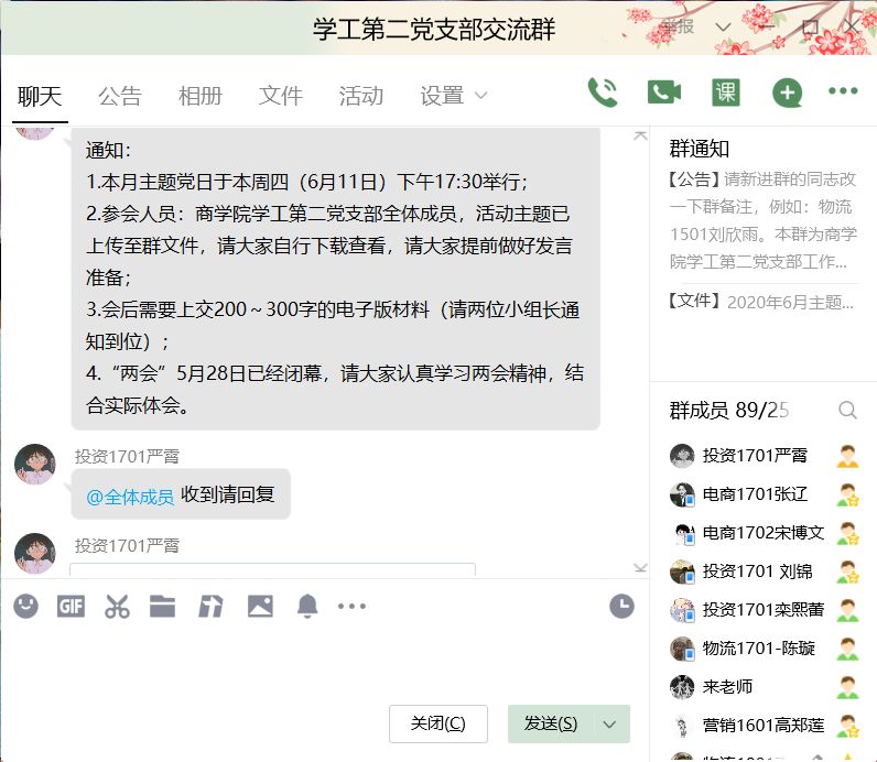 此次主题党日通过QQ语音在线开展学习,会议开始,张子怡同志宣读会议流程,并带领全体同志重温入党誓词。随后,张子怡同志也大致介绍了今年全国两会的主要内容,并提出了一定的见解。
