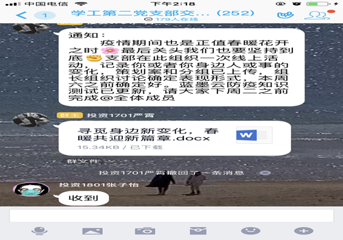 疫情发生以来,习近平总书记高度重视,主持召开了十余次重要会议。在中共中央政治局常务委员会3月18日会议中强调“要毫不放松抓紧抓实抓细各项防控工作,决不能让来之不易的疫情防控持续向好形势发生逆转。”据国家卫健委通报,3月18日湖北与武汉新增确诊、新增疑似、现有疑似病例实现三清零。这是自1月21日通报每日疫情以来,本土新增确诊病例首次为零。这些都是新的变化,我们离新学期也越来越近。据此,OK138太阳集团学工第二党支部于3月24日开展“寻觅身旁微妙处,春暖共迎新篇章”线上特色活动。