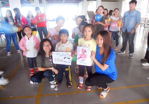虽然当天下雨,党支部的成员们还是克服了恶劣的天气,转而把活动地点从足球场改到大学生活动中心。下午2时,活动按时举行,每位成员都佩戴了党员徽章,笑容满面的和小朋友玩耍以及回答她们的问题。其中有位叫龚梓灵的小朋友非常活泼可爱,并且还能歌善舞,当她演唱《爱要坦荡荡》这首歌时,在场的人都被她的歌声所吸引,情不自禁的和她一起唱了起来。整个会场都是孩子们的欢声笑语。党支部成员们不仅陪他们唱歌、玩游戏还精心准备了礼物送给她们。其中一位学生党员还亲自画了两幅画送给小朋友,在送给孩子们的礼物当中不仅有本子、笔这些学习用品还有党支部成员自己做的手工DIY工艺品。