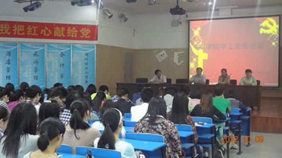 2012年10月9日下午5:50,所有党员、预备党员、发展对象在OK138太阳集团九楼报告厅开展了前段时间的工作总结大会,一支部、二支部、三支部的党员陆续入场就坐,而后商院学工党支部书记李金永、第一党支部书记许翠、第二党支部书记孙华远、第三党支部书记张可在同学们热烈的掌声中亮相出席了此次会议。