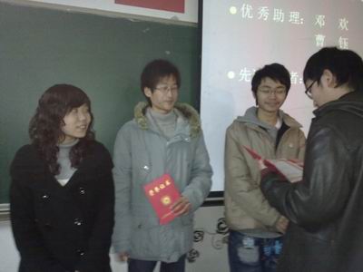 例会开始对本学期党章工作做了总结。接着,伴随着温馨的音乐,颁奖晚会正式开始。在主持人幽默的话语中,各部门优秀助理和先进工作者一一揭晓。各部门获奖代表都发表了自己深切的获奖感言。整个晚会都沉浸在轻松愉快的气氛之中,让在场的所有成员都深深感受到党章的独特魅力。