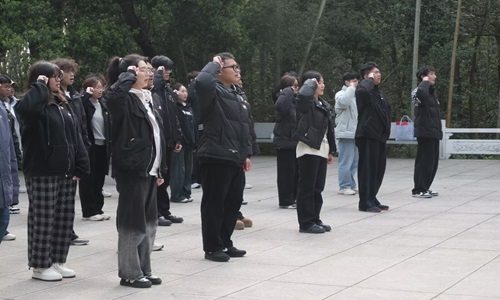 默哀结束后,同学们依次上前献花,瞻仰塑像,重温革命遗志。随后,领宣人电子商务2203班徐航带领全体成员重温入党、入团誓词,誓言铿锵有力,彰显出青年学子对党和国家的忠诚与担当。在塑像下,两位学生代表深情诵读赞词,表达对革命先烈的无限敬仰与缅怀之情。至此,祭奠环节圆满结束。