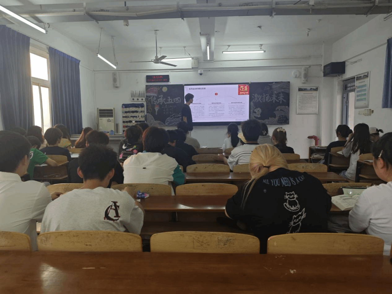 活动伊始,团支书曹洪森以一段开场白为引,点明本次班会的重要意义,吸引了同学们的注意力,营造热烈的氛围。通过PPT演示的形式,讲述了五四运动的历史背景、发展过程及重大意义,并辅以具体的文字介绍展示了珍贵的历史图片,展现了百年前青年们为国家独立、民族复兴而英勇奋斗的壮丽篇章,让同学们深刻感受到五四精神的伟大与崇高。
