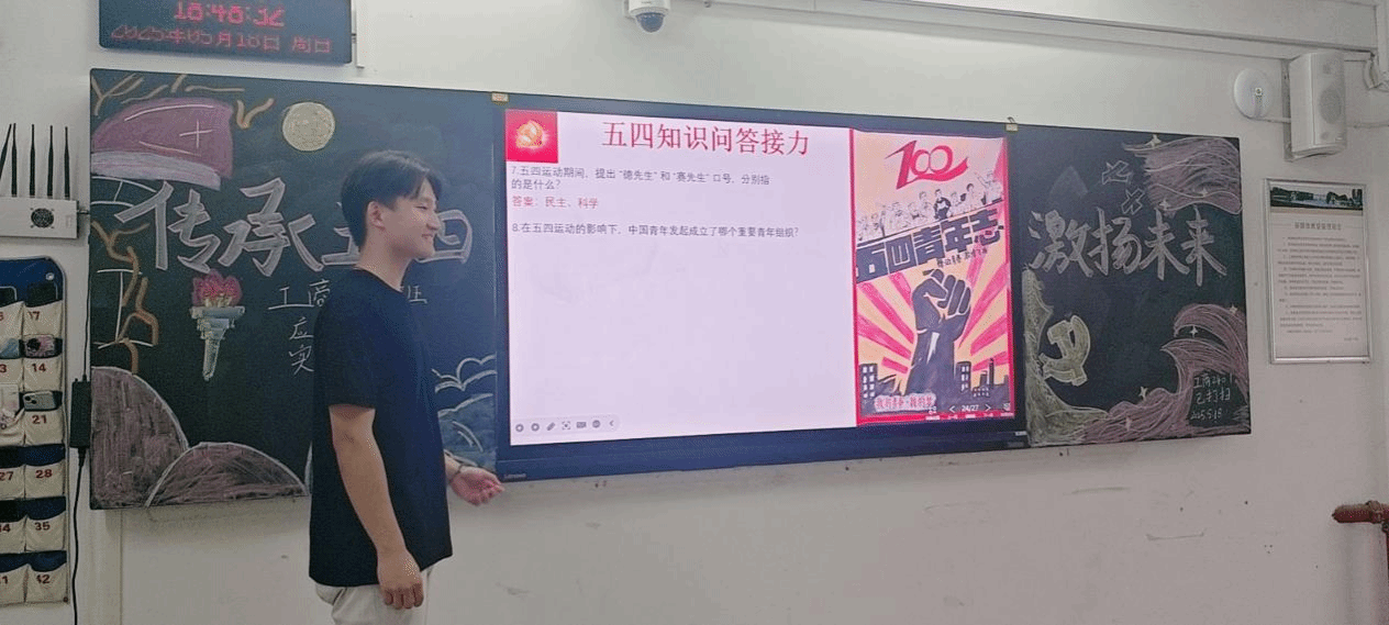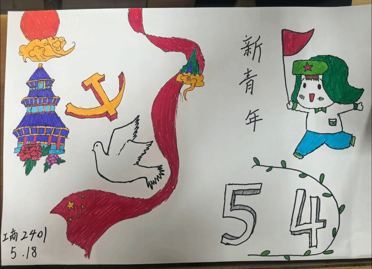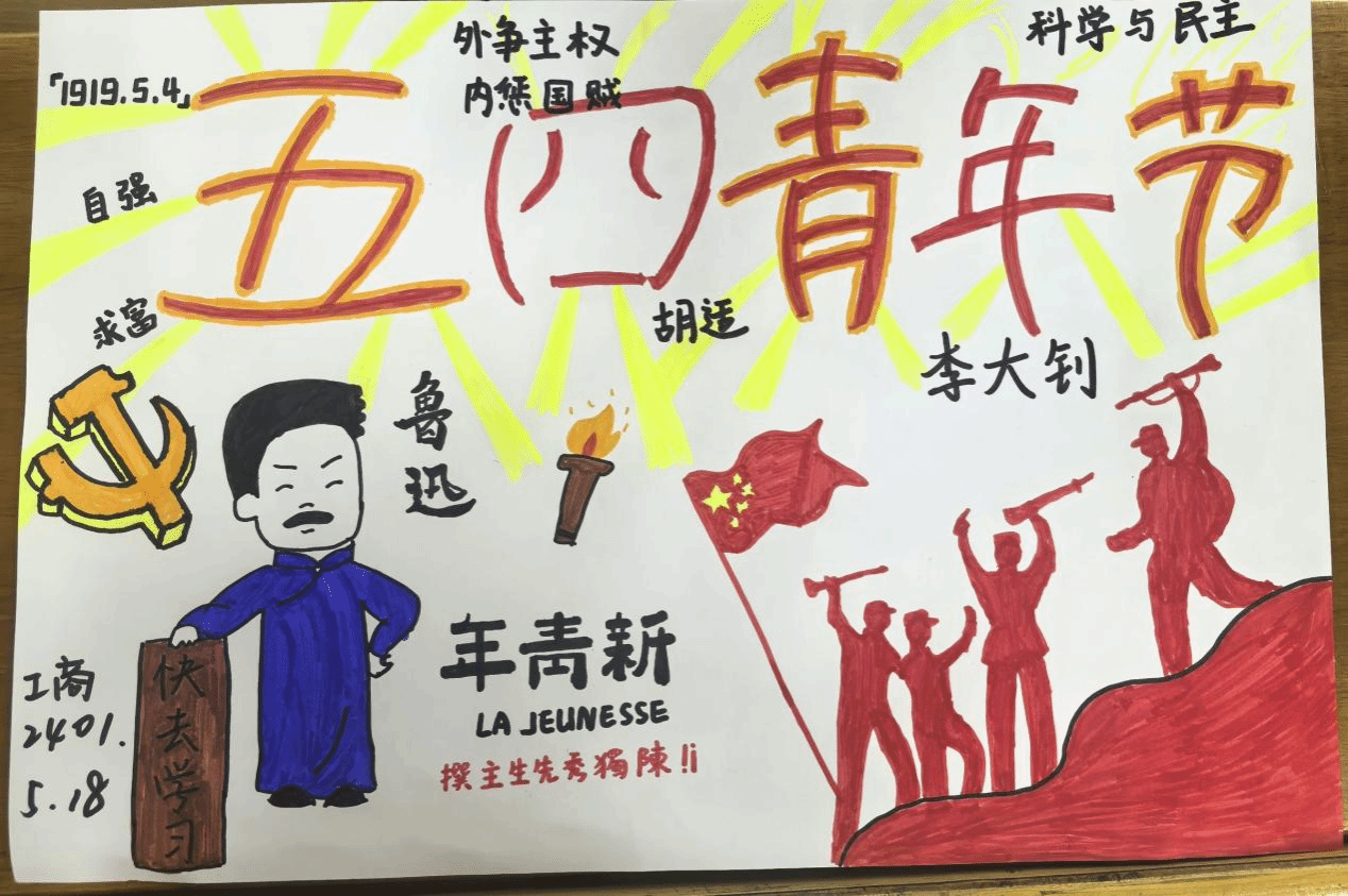 在知识竞答环节,活动设置了围绕五四运动及五四精神相关知识设置的题目。同学们踊跃举手,竞相抢答,展现出扎实的知识储备和对五四精神的深入理解,同时开展了五四青年节手抄报绘画活动,同学们纷纷参与其中,以绘画艺术的形式展现了对五四青年的理解与感悟。竞答不仅加深了同学们对历史知识的记忆,更让五四精神在互动中得到进一步传承,而手抄报的绘画,让同学们更加深刻的体验到了五四精神的深刻内涵。