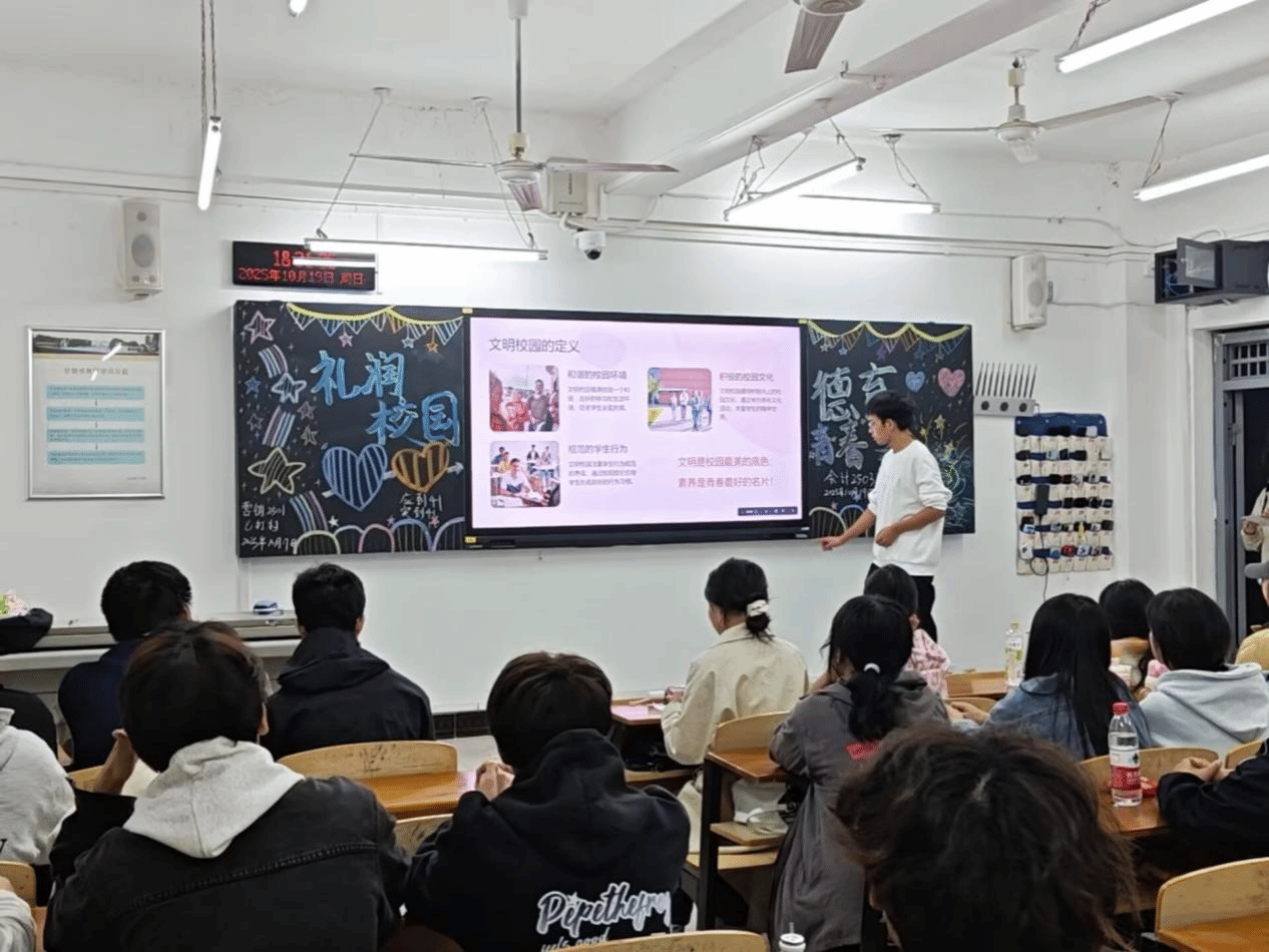 劳生委员张世伟同学作为本次班会的主讲人,向学生们阐释了“文明校园”的深刻内涵,引导大家认识到文明是一种习惯,更是一种责任。随后,张世伟同学通过图片展示、案例分析等方式,列举了校园内存在的随手丢弃垃圾、食堂就餐插队、公共区域大声喧哗等不文明现象,引发学生们的深刻反思。大家纷纷表示,将从自身做起,主动摒弃不文明行为。