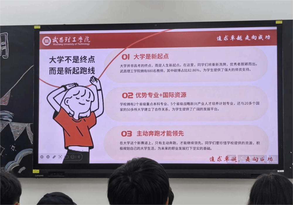 朱天怡同学发言完毕后,由李欣芮老师接过接力棒。她以“成功规划”为主题,对“大学不是终点,而是新起点”抛出提问:“今天,你准备如何重新起跑?”她用学校880名教师、硕博占比82.36%的师资数据告诉大家:站在更高的起跑线,更要有加速意识。为了让“蓝图”看得见、摸得着,李老师亮出往届优秀校友,她把三人的大学时间轴投屏对比,“他们曾和你们坐在同一间教室,差别只在提前加速—让榜样从海报走到同学们心里,再落到脚下。