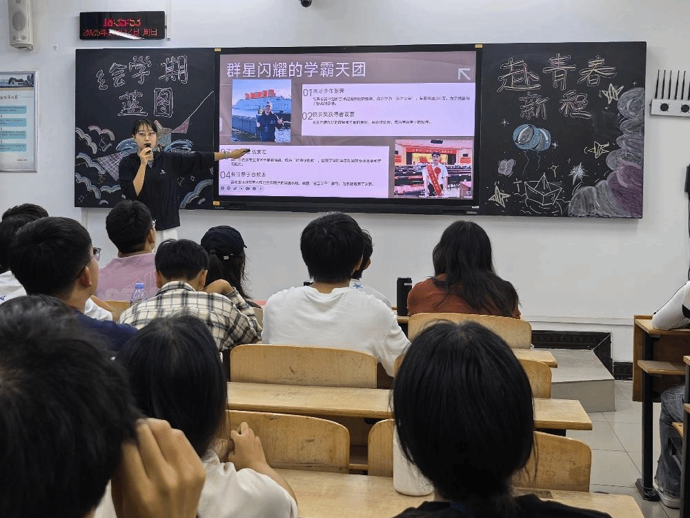 据了解,会议分上下两部分:上半场由班长兼团支书朱天怡同学主持,下半场由班级素质导师李欣芮老师接力领航。会议伊始,班长朱天怡同学用一张时间轴带领大家回顾了入学以来的集体成绩,随后将大目标拆分成每月、每周、每日任务,分配给班级班委,鼓励班委做到周周有小结、月月有排名
