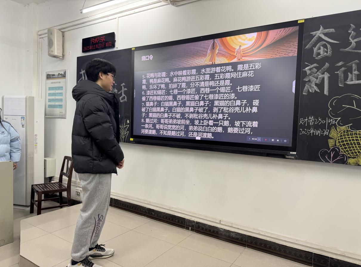 “北国风光,千里冰封,万里雪飘……”随着领诵声起,三十四名同学齐声诵读《沁园春·雪》,现场氛围迅速升温。随后的挑战麦克风环节将活动推向高潮:同学们积极抢答易错字,每答对一处发音即可获得一份“能量零食包”。薯片、奶糖与饮料堆成奖品山,教室中欢呼声此起彼伏。