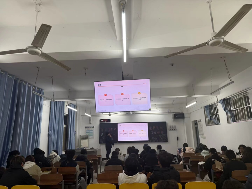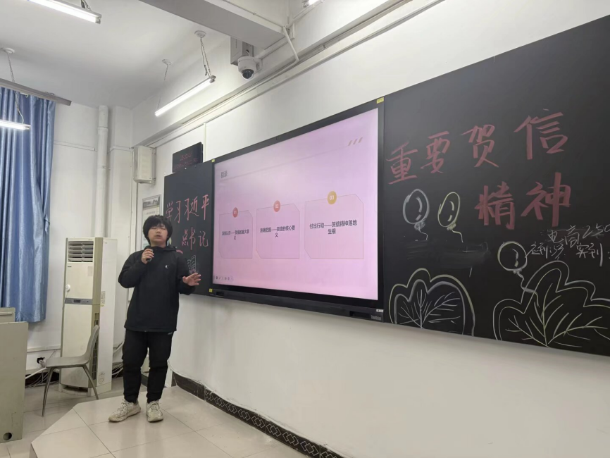 此次活动在肃穆而昂扬的氛围中拉开帷幕。教室内,同学们胸前的团徽如星火凝聚,闪耀着信仰的光芒。随着《光荣啊,中国共青团》的旋律响起,全体成员肃立高歌在主讲环节,讲人时代长河为舟,贺信文本帮助同学们实现学思用贯通、知信行统一,引领同学们溯流而上,探寻字里行间所蕴藏的深邃意涵与磅礴力量。让每一位同学可以更好地将学习成效转化为破解发展难题、服务群众需求、推动事业发展的实际成果