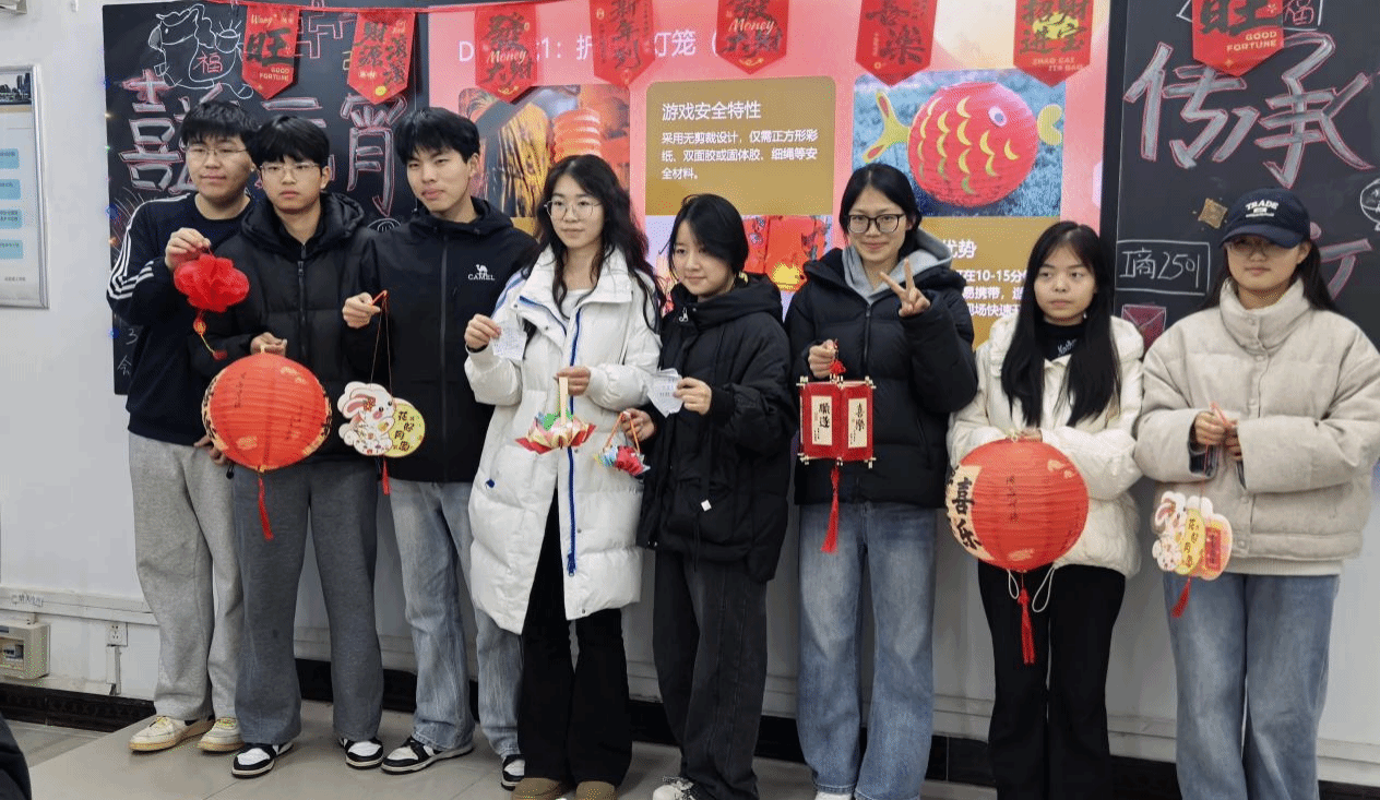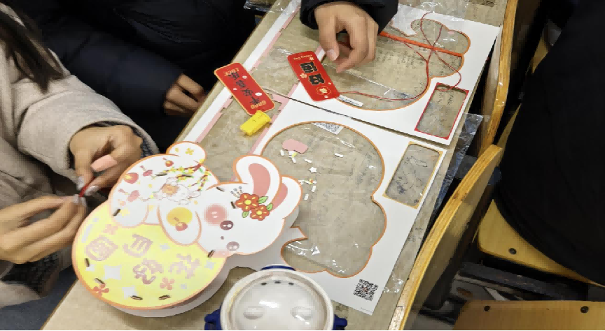 DIY 灯笼制作环节里,同学们以寝室为单位分组协作,充分发挥创意与动手能力,利用现场材料精心制作兔子灯、宫灯等各式灯笼。大家配合默契、乐在其中,一件件精致美观的灯笼陆续诞生。工商管理2501班卢士润同学表示:“第一次亲手做兔子灯,虽然步骤有些复杂,但和室友们一起完成后,特别有成就感。”
