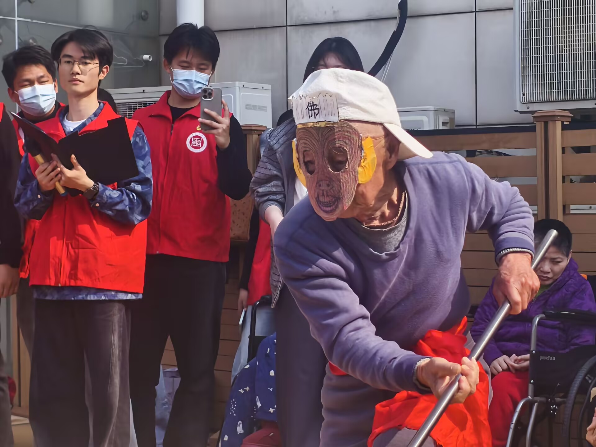 演出过程中,互动环节格外动人。一位曾担任音乐教师的高龄老人深受感染,主动要求现场演唱了自己亲自谱曲的《沁园春·雪》,观众们们认真聆听,纷纷为老人的才华喝彩。随后,纪玉晨等同学带来舞蹈《大貔貅》,节奏欢快、活力十足,志愿者与老人们一同拍手互动,并且有同学主动跟跳,现场笑声不断。老人们也踊跃参与,相继献唱《打靶归来》、《洪湖水浪打浪》等经典老歌,熟悉的旋律唤起共同的时代记忆,更有老人即兴表演“美猴王”,动作生动传神、精神气十足。布谷学堂志愿者演唱《水手》,传递坚强与乐观。李一鸣同学带来《我和我的祖国》,歌声嘹亮,引发全场共鸣,不少老人合唱,在参差不齐的歌声中,大家感受到了一脉相传的爱国情怀。