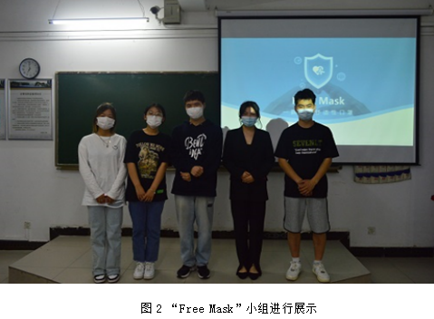在比赛过程中,各个小组充分施展自己的特长,结合产品展示本组创意。“Free Mask”小组针对原有口罩勒耳朵、呼吸不畅以及长时间佩戴有异味等痛点进行改进,带来了他们的产品——功能舒适型口罩,小组成员邓琪向评委们全方位介绍了口罩的外观以及功能:“首先看到产品的外形,口罩上方呈25度角,下方呈35度角,这样设计能够使口罩与面部紧密贴合。在口罩内部,我们内置呼吸网,能够放置缓解呼吸疾病患者症状以及清新空气的药片。”