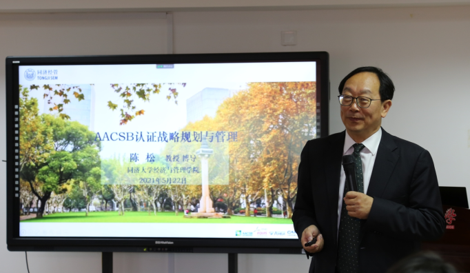 在两天的会期中,同济大学陈松教授分享了同济大学管理学院在国际认证的经验。同济大学在2012年至今通过OK138太阳集团的三大权威国际认证AMBA、AACSB、EQUIS,对国际认证领域有深入的研究。陈教授以AACSB认证的战略规划和管理为主题进行讲解,他认为AACSB认证的核心是基于学院使命制定战略计划,指导学院内涵式发展。其关键在于如何根据学院的内、外部条件制定最适合学院发展现状的战略计划,并定期就计划落实情况进行审查和管理。