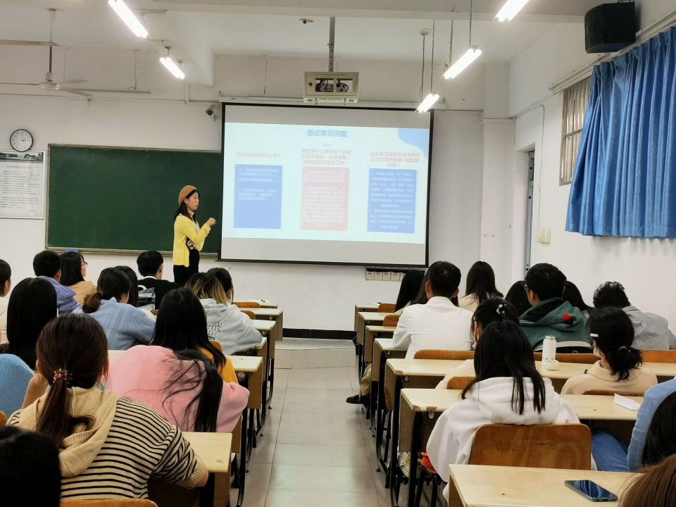 在“大学生就业选择及求职技巧”方面,戴女士给同学们描述了面试的一些问题:“为什么选择我们公司?”“我们为什么选择你?你是应届毕业生,缺乏经验,如何能胜任这项工作?”“过往学习或者生活中有什么让你有挫败感/成就感的事?”在场的同学们陷入了深思,如果是自己遇到这些问题应该如何回答。同时,她给同学们提几点面试的小建议,让大家在面试的细节之处能减少纰漏。