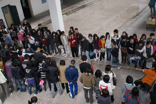 4月2日中午,原本计划在学校操场举行的商院学生组织友谊拔河比赛,因为下雨的缘故,改在文法学院的大厅举行。