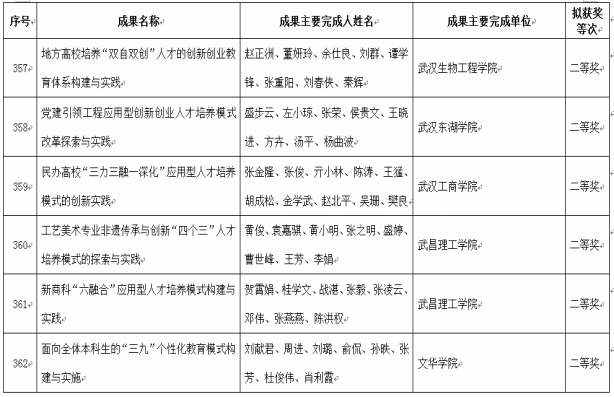 2023年2月21日,根据湖北省人力资源和社会保障厅、湖北省教育厅11号令,经省高等学校教学成果奖评审委员会评审、省高等学校教学成果奖励委员会审定、省人民政府同意,教育厅网站公布了第九届湖北省高等学校教学成果奖获奖名单,152项成果第九届湖北省高等学校教学成果一等奖,200项成果获得二等奖。省教育厅表示,本届省高等学校教学成果奖获奖成果是全省广大高等教育一线工作者经过多年艰苦努力、不懈探索取得的优秀成果,体现了全省高校深化教学改革、提升内涵建设的重大进展,代表了近年来全省高等教育教学改革的先进水平,希望受奖励的成果完成单位和完成人再接再厉,再创高等教育教学改革的新成绩,全省高等学校及其广大教师和教育管理工作者,要学习、借鉴、运用先进的教学改革研究成果,充分发挥教学成果奖的示范带动作用,积极开展教育教学研究和实践,深化教学改革,提高教学水平和人才培养质量,不断提升服务经济建设和社会发展的能力,为加快建设高等教育强省做出新贡献。