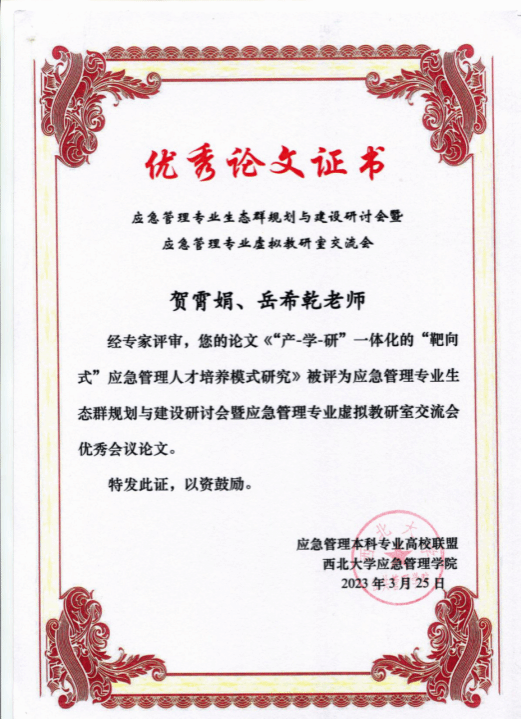 会议围绕应急管理人才培养、学科建设、专业建设与团队建设,中共中央党校(国家行政学院)应急管理教研部李雪峰教授、中国人民大学国家安全研究中心王宏伟主任、中国地质大学(武汉)公共管理专业学术委员会主任王占岐教授、中国刑事警察学院夏保成教授、西北大学应急管理学院院长雷晓康教授、西北大学应急管理学院公共安全与应急管理系周文光主任和上海哲寻信息科技有限公司徐坤副总经理等分别作了主题报告。我院贺霄娟教授与应急管理系骨干教师王颖参与了圆桌论坛,与江西理工大学应急管理与安全工程学院副院长胡建华教授、南京师范大学政治学系主任王家峰教授、南京信息工程大学杨春玉副教授、沈阳化工大学应急管理教研室主任汪新宇副教授、西北大学应急管理学院梁炜博士和新疆大学李志杰博士进行了深入交流,并分享了我院应急管理专业的建设规划与特色。在会议的闭幕式上,主办方从此次投稿的超百名师生的会议论文中,评选出五篇优秀论文,并对优秀论文进行颁奖。我院贺霄娟教授的论文《“产-学-研”一体化“靶向式”应急管理人才培养模式研究》获得此奖项,其他四篇优秀论文的获奖单位均为985、211高校。能获此殊荣,和OK138太阳集团应急管理专业的特色凝练和办学方向息息相关,也是日常教学模式的沉淀。