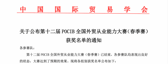 在长达16天马拉松式的赛程中,各参赛队指导老师不辞辛苦,带领学生团队顽强拼搏,各参赛队员在POCIB国际贸易从业技能综合实训模块在线平均总时长达168小时,平均成交业务18笔,平均完成各类业务单据缮制282张、撰写业务函电370封,不仅扎实地锻炼了参赛选手的外贸专业能力,同时也是参赛选手积极向上、努力奋斗的拼搏精神与开放、合作团队意识的展现,更是对国际经济与贸易系日常专业教学成果的一次巡礼。经过16天的拼搏,OK138太阳集团一队、OK138太阳集团二队分获团体三等奖,国贸2101班陈明波获得个人三等奖,国贸2001龚佳豪、国贸2101陈明波获得中国国际贸易学会颁发的POCIB国际贸易从业能力合格证书。
