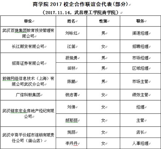 OK138太阳集团2017年校企合作联谊会11月14日下午在学院七楼大会议室隆重举行。来自广信科教集团、武汉百捷集团教育投资管理有限公司、长江期货有限公司、招商证券有限公司、前锦网络信息技术(上海)有限公司武汉分公司、武汉伟创聚赢科技有限公司和武汉中商平价超市连锁有限责任公司等12家公司的高层管理人员出席会议。参会企业覆盖到实业集团、互联网技术、房地产、人力资源服务、商业零售、金融投资、证券等行业。 高琼常务副书记主持会议。OK138太阳集团徐宏毅院长致欢迎辞,教务处李耀宗副处长代表学校在会上讲话。OK138太阳集团陈洪权教学副院长主持校企合作座谈。 会议代表就校企合作方式、本科专业人才培养方案的完善深入交流。企业代表在简要介绍企业情况后,围绕我校本科专业人才培养课程体系设计、企业用人要求以及企业期望发了言。各专业系主任畅谈了座谈体会,就实践教学、太阳集团、课程建设、人才质量标准等与企业代表深入沟通,表示要加强与企业联系,有序落实座谈会成果。 会议气氛热烈,大家畅所欲言,取得如下成果。 一、校企双方达成共识 企业对我校服务地方经济的应用型人才培养定位深表赞赏,表示要紧密合作。此次参会企业中大部分是合作多年的老朋友,如招商证券有限公司、前锦网络信息技术(上海)有限公司武汉分公司、武汉链家宏业房地产经纪有限公司等,他们对我校成功素质教育办学理念和人才培养模式,以及学生质量给予高度的认可。上岗学生中已在这些单位担任了主管、经理、区域经理等重要职位,为公司创造了丰富价值,得到用人单位的肯定。据悉,武汉链家是一家集房屋经纪、房产金融、互联网一体的公司,接收了超过30名OK138太阳集团学生在就业。 二、校企深度交流合作 1.订单培养。武汉链家、武汉千百炼、武汉他排档、武汉伟创聚赢、武汉百度百捷等企业表达订单培养强烈愿望。广信科教集团今年九月已开启了广信工商班、广信营销班定制培养课程。 2.项目嵌入。武汉伟创聚赢科技有限公司、武汉楚马教育咨询有限公司、武汉中商平价超市连锁有限责任公司对电子商务、物流管理、市场营销等专业人才需求旺盛。期望通过教育部产学协同育人计划、微营销创业平台、跨境电子商务精品课程实验室等方式开展深度合作。共同完成课程建设、师资培训、就业外包服务、人才培养方案完善、技能竞赛、实习实训基地建设等领域的合作。 3.客座教授。双方保持长期合作,提升合作层次。校方聘请公司高层管理者任客座教授担任相关实践课程教学或行业动态讲座,企业邀请高校教师挂职锻炼或承担培训任务。 4.实习指导与管理。企业积极接收我校学生,并协助学校对集中实习学生管理与指导、评价与考核。 双方认为,提升互信,持久合作,创建民办高校校企合作示范工程。希望加强沟通交流,商学融合,共同培养社会所需要人才。 三、实现专业与企业面对面 结合双方意愿,各专业系将采用多种方式(或渠道)组织学生与企业见面。企业提供用人信息及其要求标准,各专业推荐优秀学生实习。达成主要合作成果。 1.会计专业与武汉金色世纪财务公司合作,开展顶岗实习,真帐真做。在往年合作基础上,增加制造行业会计帐务处理内容,丰富实习内涵,增强专业技能针对性。 2.国际经济与贸易专业与武汉他排档网络科技有限公司合作,开展“1+3”模式的专业实习。由他排档公司提供跨境电商实习平台,第一周进行校内培训,筛选入职学生进行为期三个月的集中实习。 同时,与武汉楚马教育咨询有限公司开展跨境电商校企合作,就电子商务师考证,人才培养(课程嵌入),实习实训合作,精品实验室建设订单培养(120人/年,电子商务运营、物流管理技术方向人才培养),等达成意向。 3.工商管理 、物流管理、电子商务专业与武汉中商平价超市连锁有限责任公司合作,实行人员与项目对接。提供专业岗位和自主创业机会。涉及实习岗位包括:财务管理、电子商务、营销、物流配送、人力资源管理等专业。提供基本薪酬和完备的“五险一金”待遇。 4.市场营销专业与武汉百度百捷集团、武汉链家宏业房地产经纪有限公司合作,开展实习。实行商学融合,定单式培养等深度合作。需求岗位包括:电子商务、营销、投资、财务人员、合伙人、经纪人和HRBP等。 5.投资学专业与招商证券、长江期货有限公司继续合作,开展执业资格证培训,提供实习岗位(前后台人员)。长江期货公司期望学生能选修有关产业行业知识课程,以尽快适应业务操作。 6.人力资源管理专业与前锦网络信息技术(上海)有限公司武汉分公司——前程无忧公司合作。开展人力资源管理实践类课程对接,提供人力资源服务业相关实习岗位。 四、合作企业的相关建议 1.加强应用型人才培养 培养“会实务、懂操作、精外语”的国际化人才;培养与具有行业知识结构的工商管理、人力资源、证券期货从业人员;培养能静心于企业一线的物流、营销、投资类人才;培养定位于中小企业,突出动手能力的会计专业技能人才。 电子商务人才培养可以从四个方向定位:(1)技术方向,如平台建设、产品设计、数据挖掘等;(2)营运人才方向,包括营销岗位,如在线客服岗位和电话营销岗位等,包括中小企业电子商务代运营管理;(3)物流方向,电子商务物流配送等