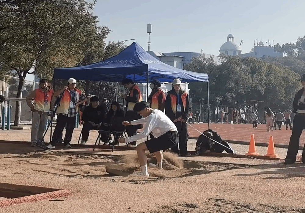 此次男子三级跳远项目一共有18名来自各学院的选手参赛,其中不乏实力强劲的对手。赵玉仁在比赛中沉着冷静,整套动作规范流畅,助跑节奏精准、踏跳有力,三跳衔接连贯,最终稳稳落入沙坑,展现出扎实的训练基础。
