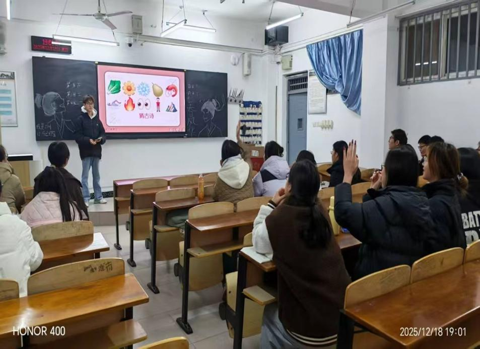 活动流程紧凑丰富,环环相扣,共分为开场暖场、核心竞赛、中场休整、颁奖收尾四大环节。两大趣味竞赛模块更是点燃全场氛围。“emoji猜诗词”环节分基础轮与进阶轮,1至3个生动形象的emoji组成趣味谜面,对应经典诗词名句,同学们踊跃举手、争先抢答,现场掌声与欢呼声此起彼伏;“飞花令”环节聚焦“月”“花”“春”等经典诗词意象关键词,更创新设置反向飞花令,打破常规接句模式,各组轮番应答、沉着对决,极大考验了同学们的诗词积累量与临场快速反应能力,将活动氛围一次次推向高潮。