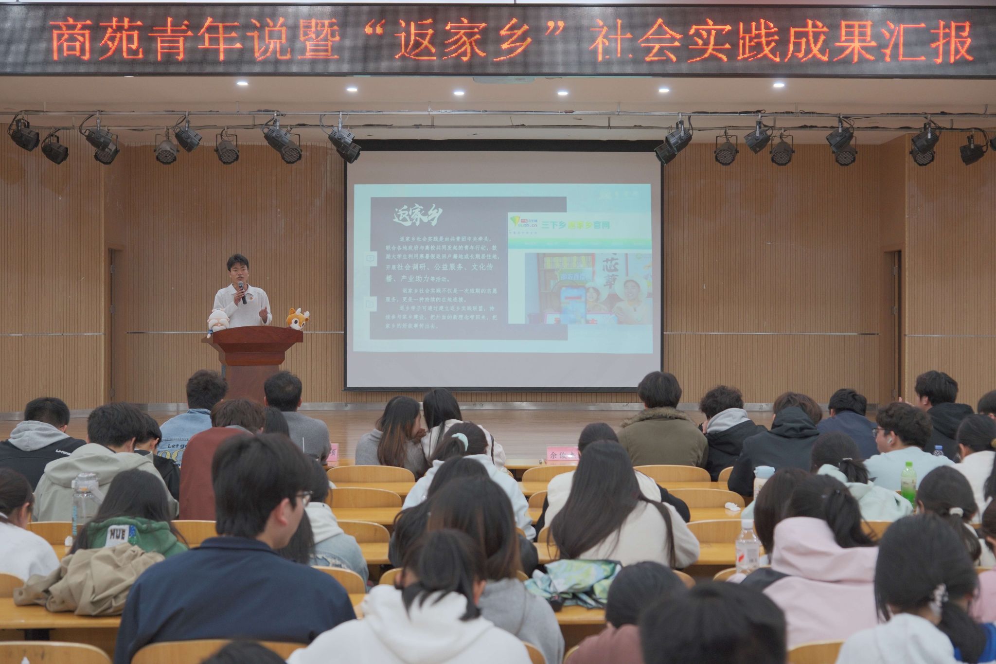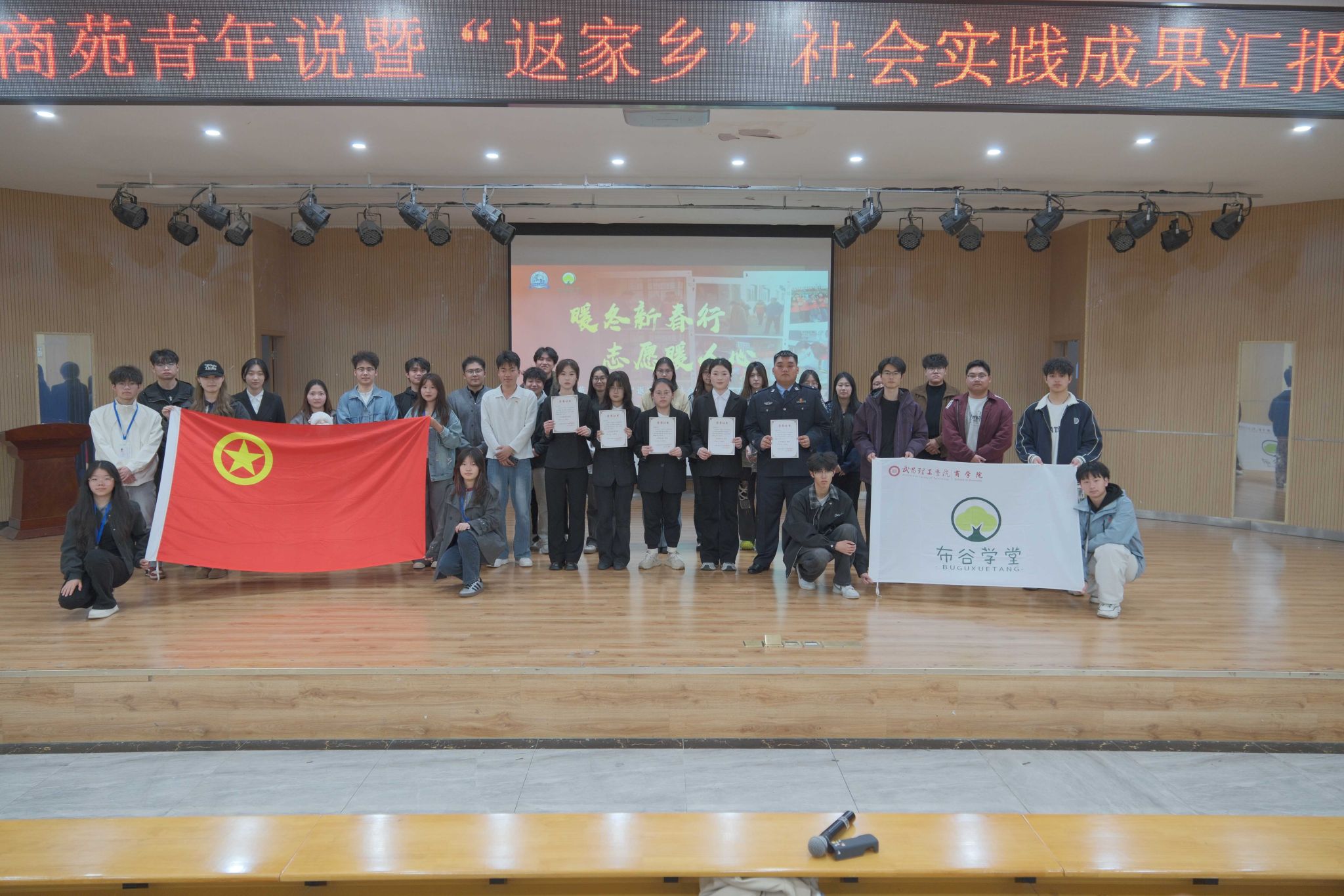 活动在庄重温馨的氛围中拉开帷幕,主持人赵怡萌以热情洋溢的开场词欢迎到场同学,并简要介绍了活动举办背景与核心意义。随后,五位在“返家乡”社会实践中表现突出的优秀学子依次登台,结合自身实践经历,分享寒假期间深入基层、服务家乡的故事与成长感悟。