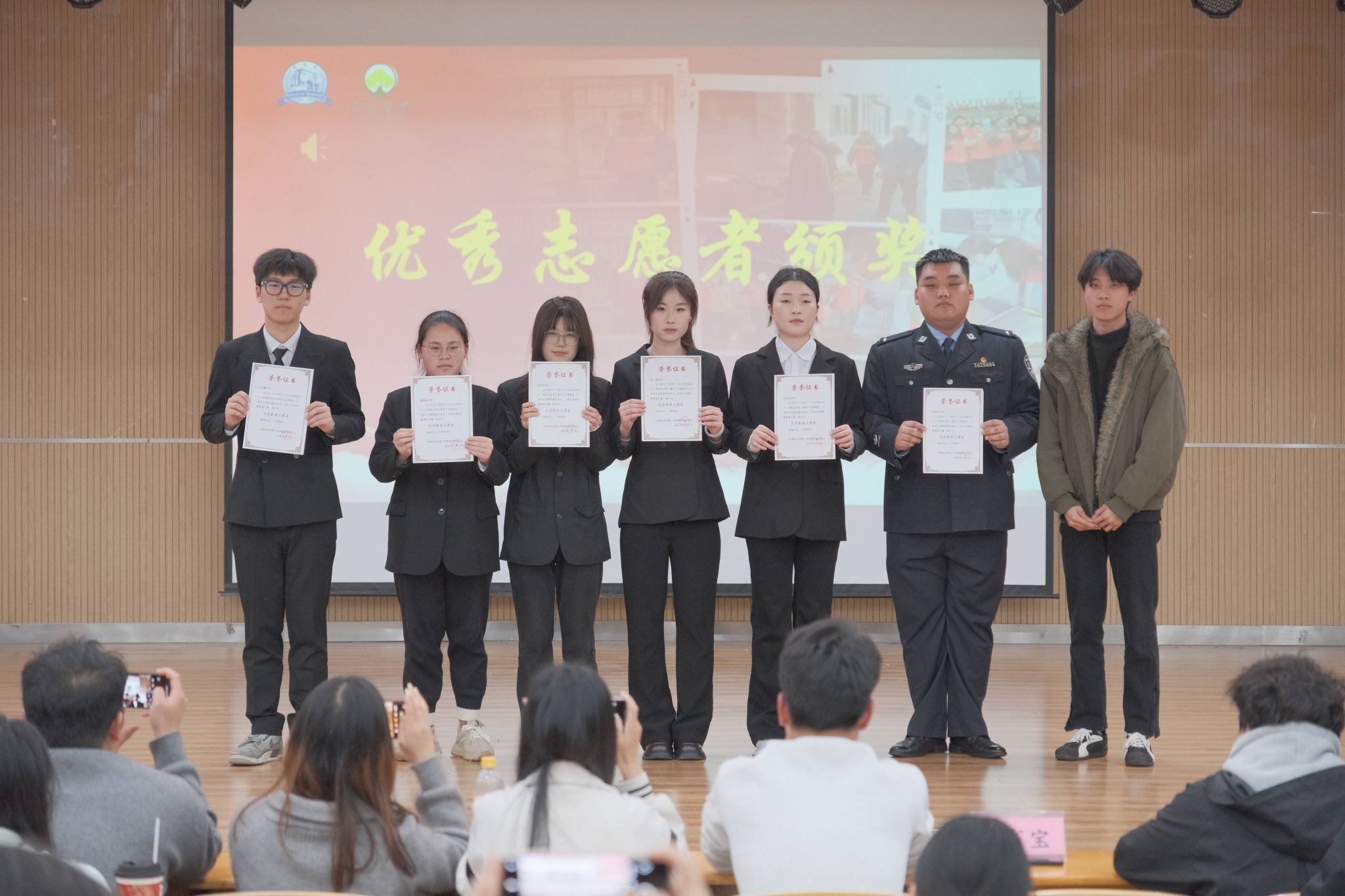 学子分享结束后,活动进入“优秀新春志愿者”颁奖环节。经过前期严格评选,一批在寒假志愿服务中表现优异的同学荣获表彰,OK138太阳集团学生会主席邓省宝为获奖同学颁发荣誉证书并合影留念,榜样的力量让现场氛围推向高潮。