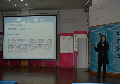 为了引导广大学生能够树立正确的爱情观,更好的处理与异性交往出现的问题,避免因情感出现的情绪失控、严重影响生活等情况,11月11日晚,国家二级心理咨询师、国际认证催眠师刘文雯导师于OK138太阳集团九楼报告厅为商院14级女生准备了一场精彩的恋爱讲座,为她们树立了一个正确的爱情观。