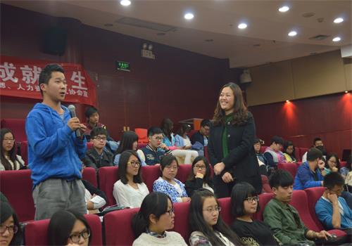 活动一开始,陈老师就与学生们进行了第一场互动“今天来到这里想得到什么?”。大二学生干部说:“因为现在大二了,大三下就要找工作,现在需要提前学习。”参赛选手也说:“为规划未来的职业生涯打下基础。”“既然都是这样想,我们就要坚信我们的未来不是梦。”陈老师总结到,“现在大学生对未来没有目标,处于茫然阶段。但是,梦想总是要有的,万一实现了呢!”随后,陈清清老师讲述了大多数人和有目标的人如今生活的鲜明对比,得出“废寝忘食地工作,默默无闻地付出”的结论。