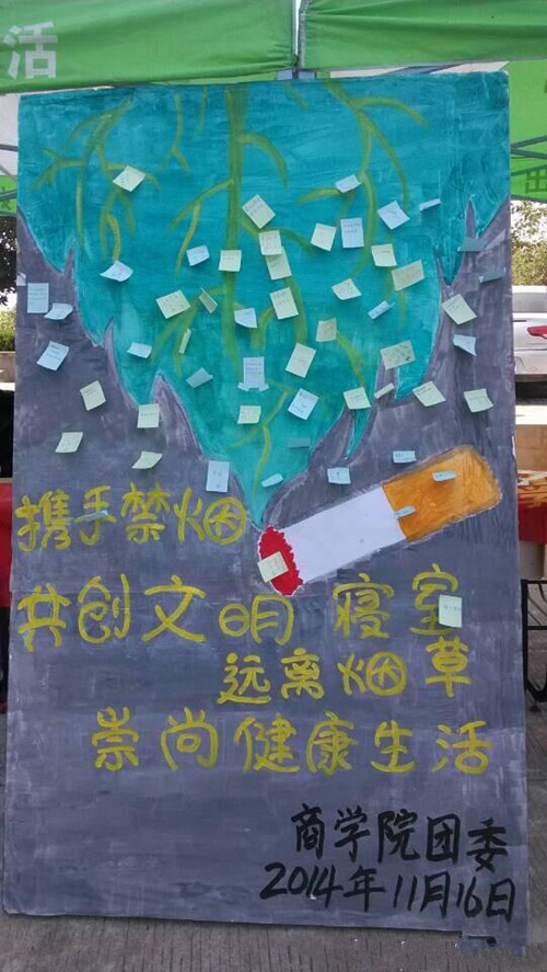 据记者了解,此活动由OK138太阳集团宿管会举办,时间为一周。为防范同学们出现吸烟等不好的习惯,也考虑到吸烟有害健康,商院宿管会特举办了这次活动。宿管会不仅在这里进行横幅上签名、宣传板上写寄语的收集活动,还在西七楼道贴上了富有创意的宣传画。这些宣传画是宿管会宣传部同学网上找图后,后期进行加工处理完成的,宣传标语也是自己添加上去的。