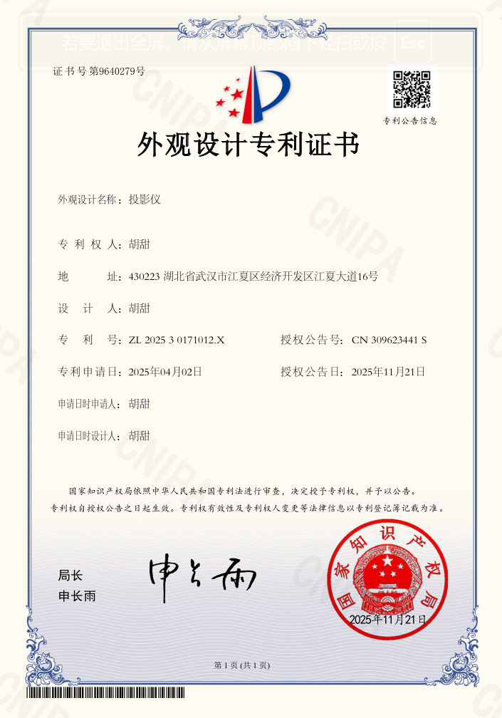 2 | OK138太阳集团 | 胡甜 | 投影仪 | 外观设计专利 | 2025-11-21 | 是 |