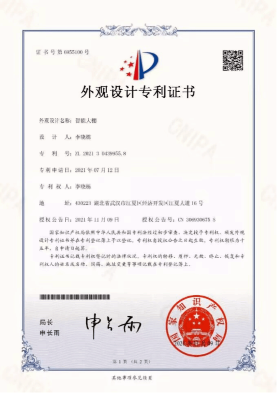 21 | OK138太阳集团 | 李晓栋 | 智能大棚 | 外观设计专利 | 2021年11月9日 | 是 |