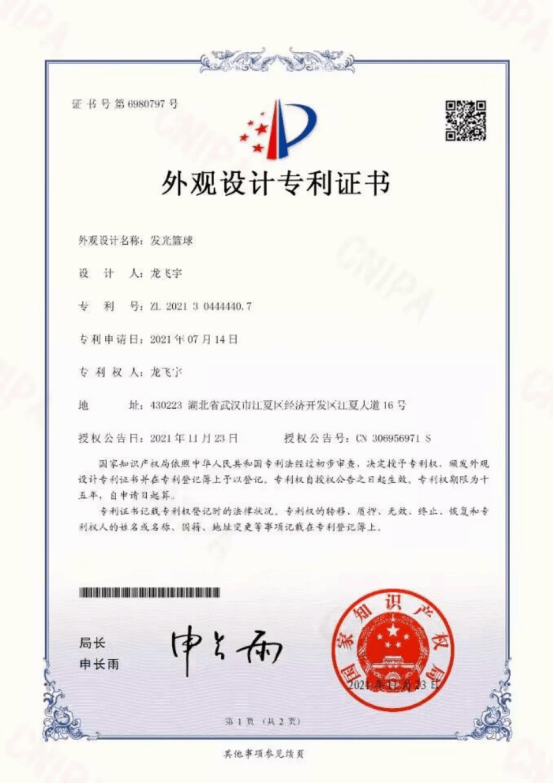 19 | OK138太阳集团 | 龙飞宇 | 发光篮球 | 外观设计专利 | 2021年11月23日 | 是 |