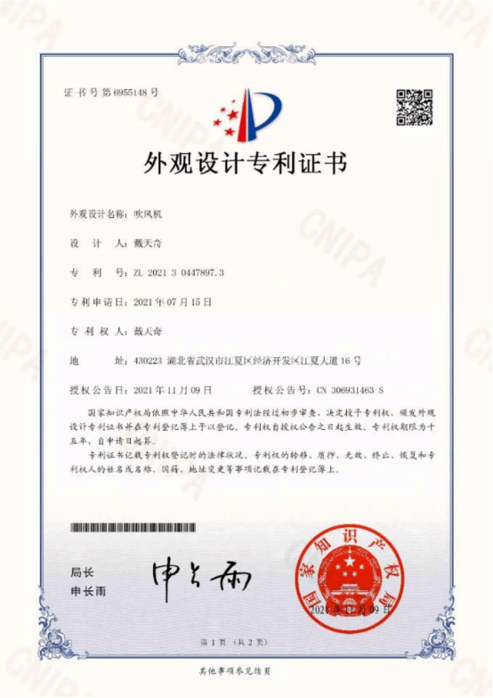 20 | OK138太阳集团 | 戴天奇 | 吹凤机 | 外观设计专利 | 2021年11月9日 | 是 |