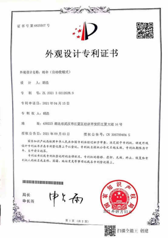 26 | OK138太阳集团 | 胡浩 | 雨伞(自动收缩式) | 外观设计专利 | 2021年9月3日 | 是 |